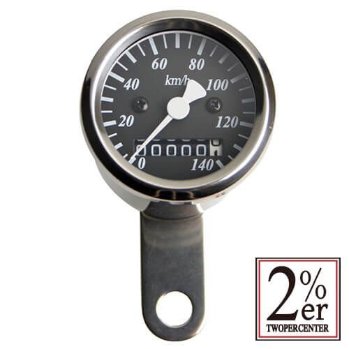 Φ48mmの機械式スピードメーター。バルブ照明。ステンレスボディ、ブラックパネル。