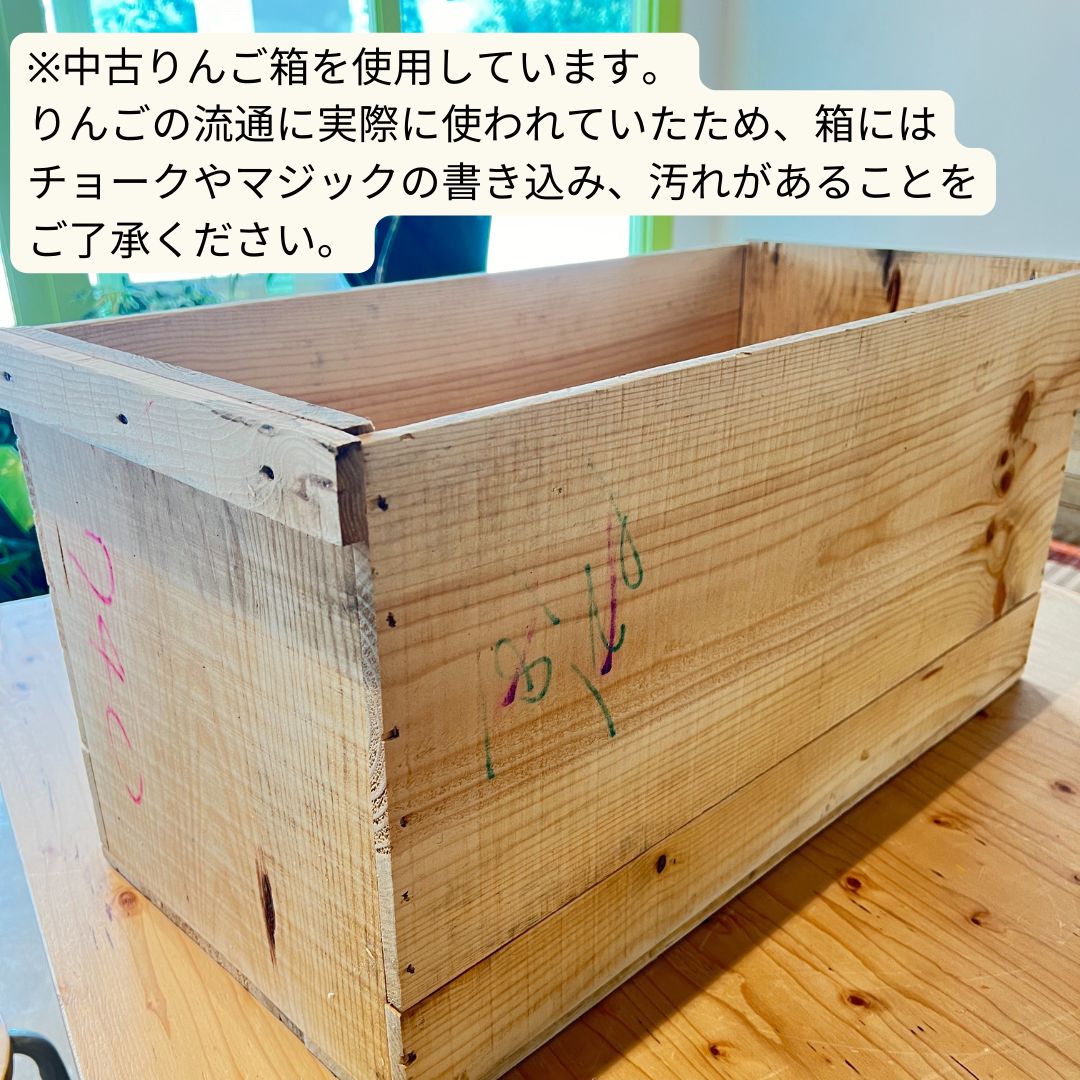 長年、りんごの輸送に使われていた新品のりんご箱をアップサイクルしています。チョークやマジックによる書き込みや輸送時についた傷があり、それが独特の味わいとなっています。また節が抜けた穴や木材の収縮による反りや隙間、割れや出っ張りもございます。