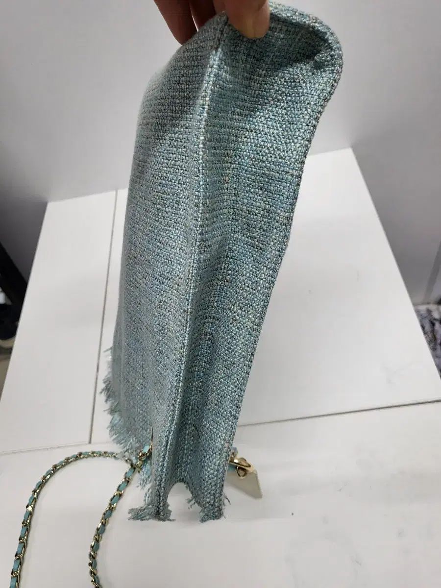 ポメルキャメル生地のツイードクロスボディバッグです。爽やかな水色と、ほのかなツイード織りが高級感があります。チェーンストラップがアクセントになっており、カジュアルでありながら洗練されたルックスになっています。ご不明な点がなければ、すぐに安心してお支払いいただけます!