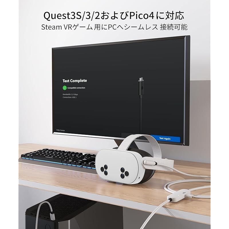Quest 3S/3/2、Pico 4 に対応:Quest3/2は、Syntechによって製造されたOculusリンクケーブルと安全に互換性があります。リンクケーブルの別の充電ポートを元の充電器に接続することで、一日中の拡張VRゲームセッションが可能になります。(注釈:元のQuest2充電器は10Wの電力を提供します。ゲームプレイを中断せずにプレイするために、Quest2には18Wまたはそれ以上の電力の充電器を使用することをお勧めします)