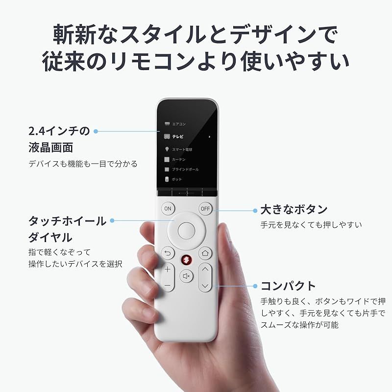 ★【斬新なスタイルと直感的なOSで、誰でも使いやすい】2.4インチの液晶画面+19個のボタン+タッチホイールを組み合わせ、「シンプルで使いやすい」を一番にデザインしました。画面下の4つのカスタムボタンを使って、対応するデバイスの詳細メニューを呼び出せます。従来のリモコンの多様性を損なわず、シンプルでスムーズな操作性を実現。子どもからお年寄りまで「普通のリモコン」と同じようにお使いいただくだけます。