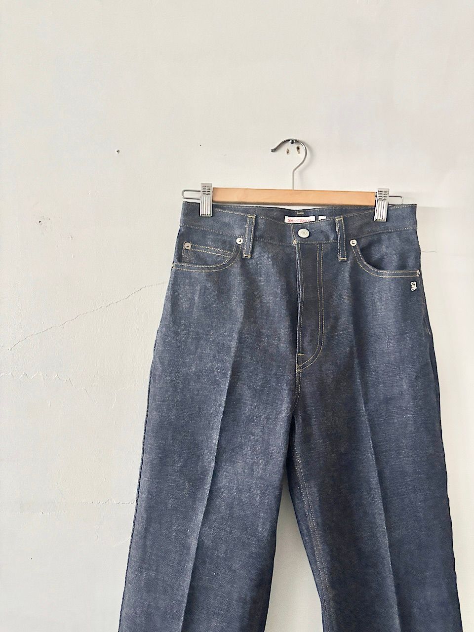 センタープレスを入れて脚がまっすぐ見えるよう仕立てたストレートデニムです。シルエットを通常のカジュアルなデニムより、スラックスのようなパターンメイクでスッキリ見えるようキレイに仕上げています。お尻が小さく、脚が長く見えるラインが特徴です。通常のデニム以上に身体馴染みと経年変化を楽しんでいただけます。