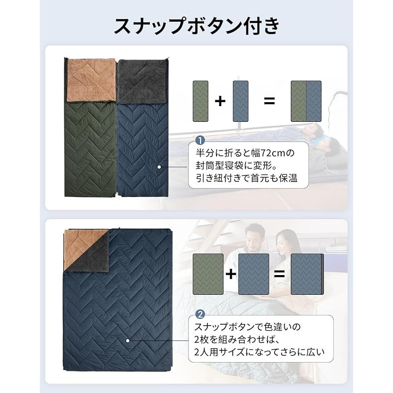 大サイズ+寝袋変形:200×145cmの広面積で2人使用時も全身をカバー。半分に折ると72cmの封筒型寝袋に変形、付属の引き紐で首元保温を実現。収納時34×19cmのコンパクトサイズで軽量・収納性に優れ、アウトドアでの利便性を向上。