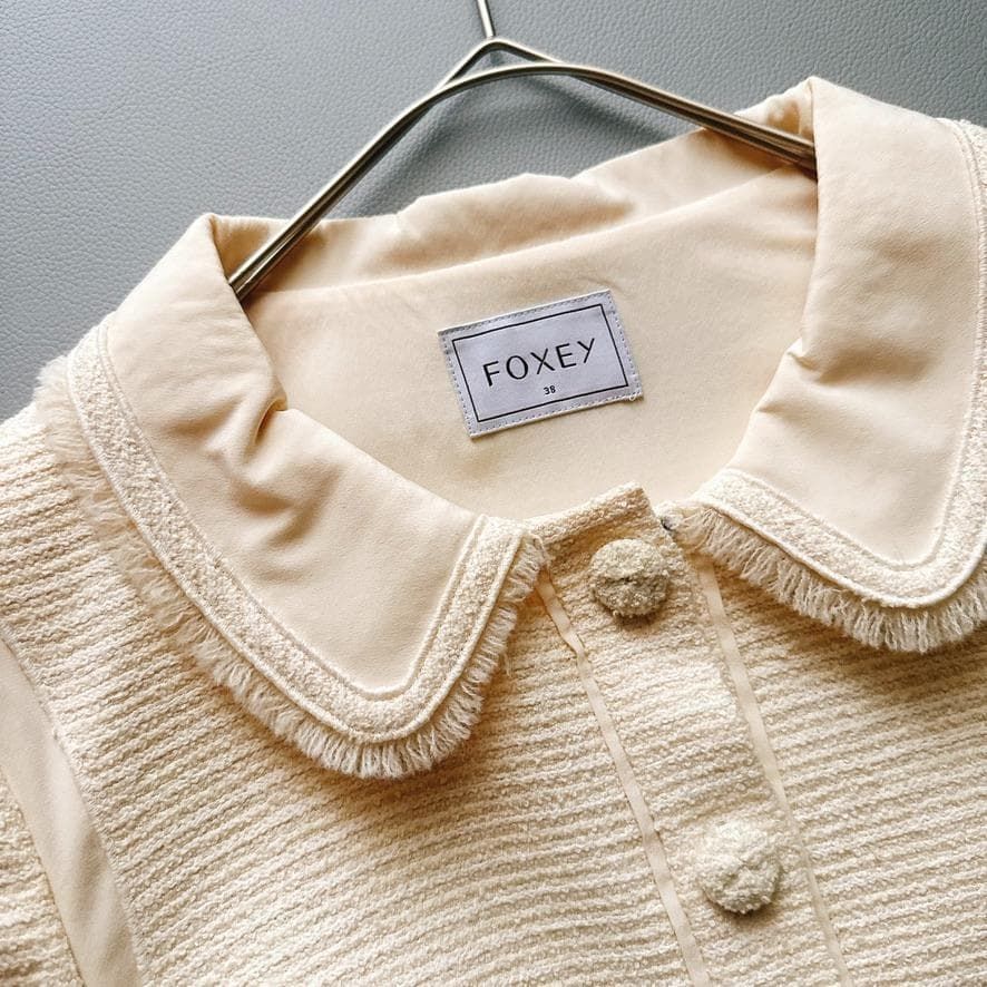FOXEY フォクシー ツイードジャケット くるみボタン 丸衿 フリンジ アイボリー レディーツイード 38 フォーマル 卒入学