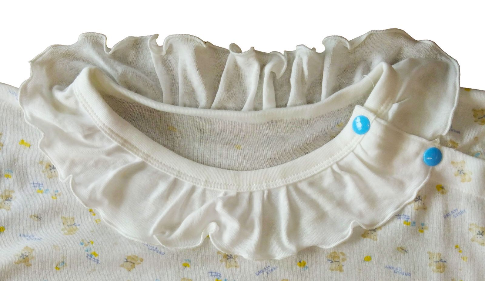首周りはかわいいフリルが付いています。2カ所のボタンで留めていただけます。