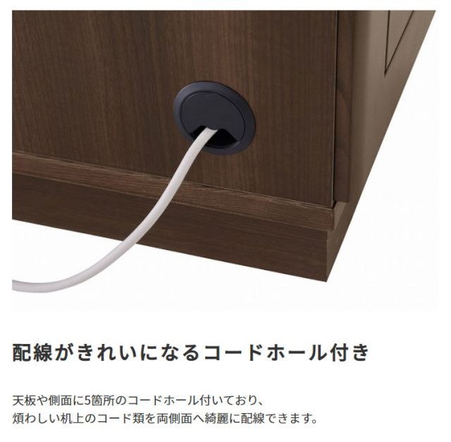 説明高品質な木製ならではの重厚感日本一の家具の町、大川のメーカーと共同開発した、国産木製デスクです。高品質な木製ならではの重厚感と、両袖デスクとしての必要十分な機能性を兼ね備えた、まさに伝統と革新を併せ持つ一品です。右袖の3段の引き出しには、一箇所で同時に施錠できるオールロック錠が標準装備されておりますので、セキュリティ面も安心してご使用いただけます。また、滑らかなダブルサスペンションレールを採用した引き出しは、奥まで出し入れし易い仕様です。さらに、天板や側面などの計5箇所にコードホール加工が施されており、雑多になりがちなLANケーブルや電話線などのコード類を、見た目もスッキリと収納できます。