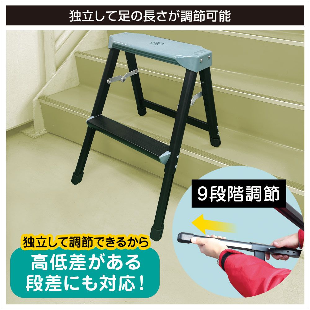 見た目はコンパクトな脚立ですが、4本の脚はそれぞれ独立して調整可能。凸凹地や高低差のある段差でも、しっかり安定。