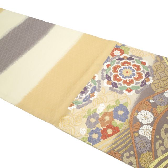 象牙色・灰紫・薄い黄茶 が段状にぼかし織りされた地。
