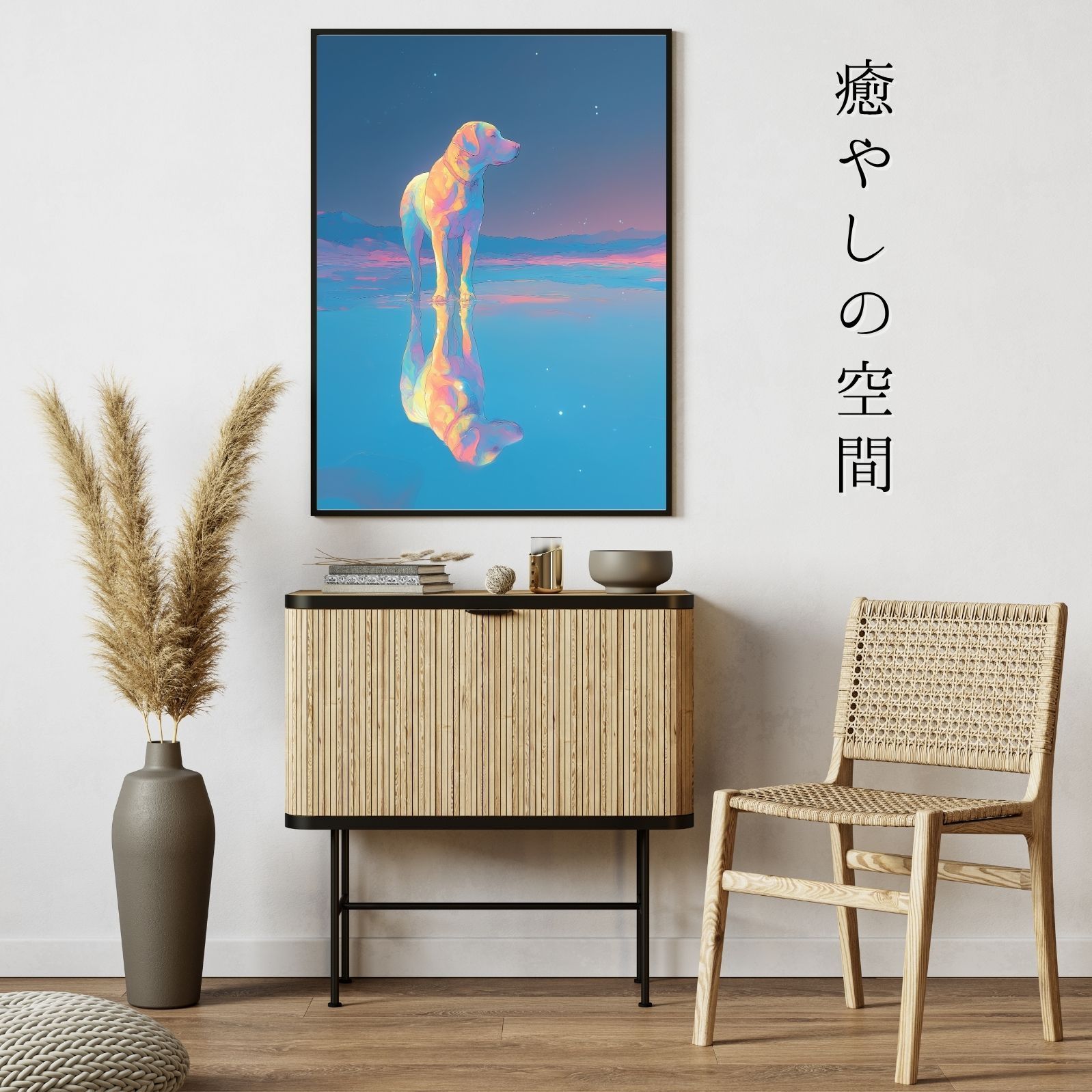 ラブラドールレトリバー犬がオーロラのような光に包まれて、幻想的な色彩が空間にやさしく溶け込み、見るたびに癒しを与えてくれるアートポスター作品です。