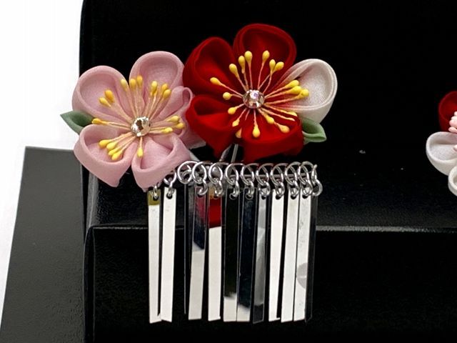 七五三 髪飾り 3点セット 7歳 つまみ細工 勝山セット 赤xピンク 梅