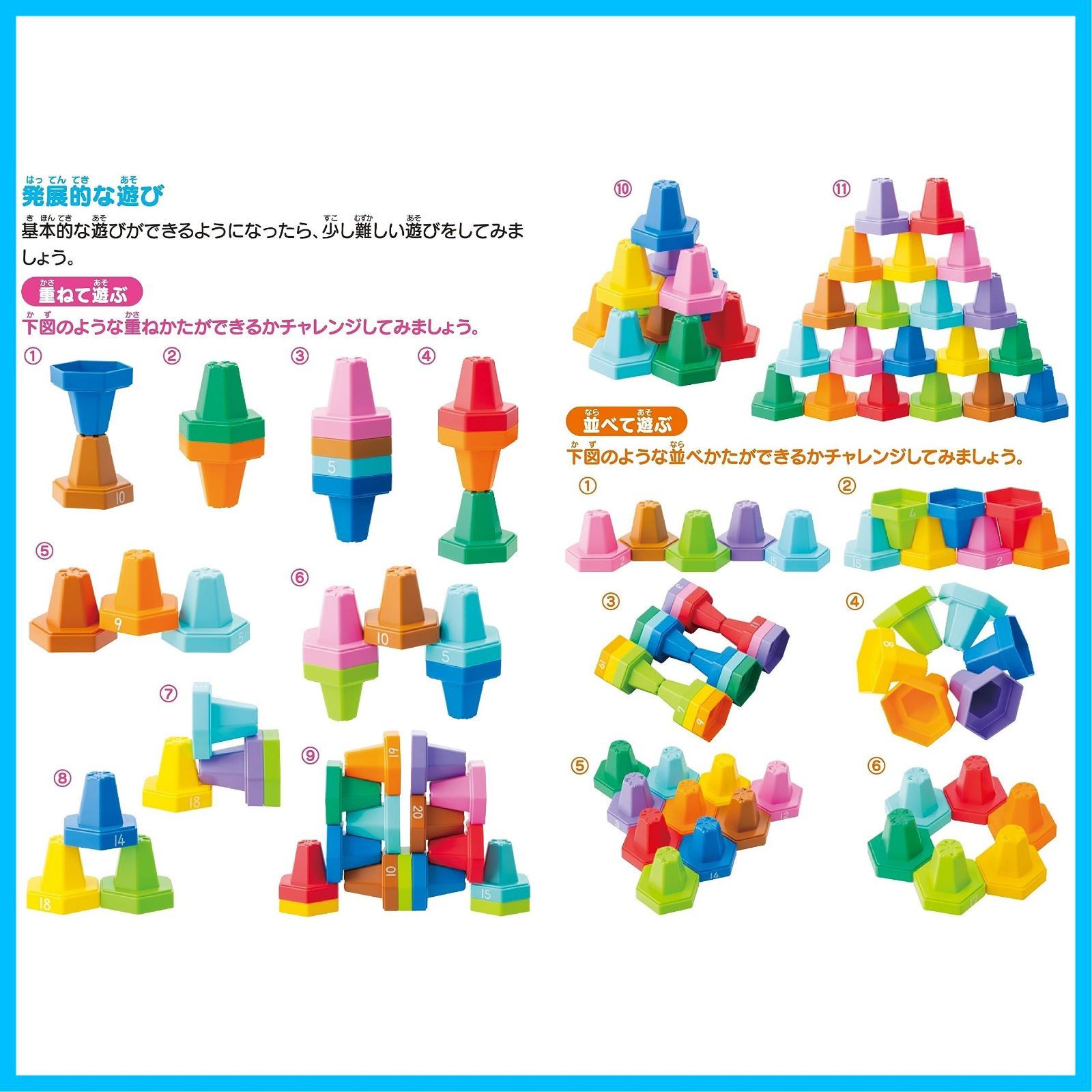 【遊び方(発展編)】創造的な難しい並べ方をしたり、20までの数字の順で重ねたり、工夫した並べかたをしたりして遊びましょう。