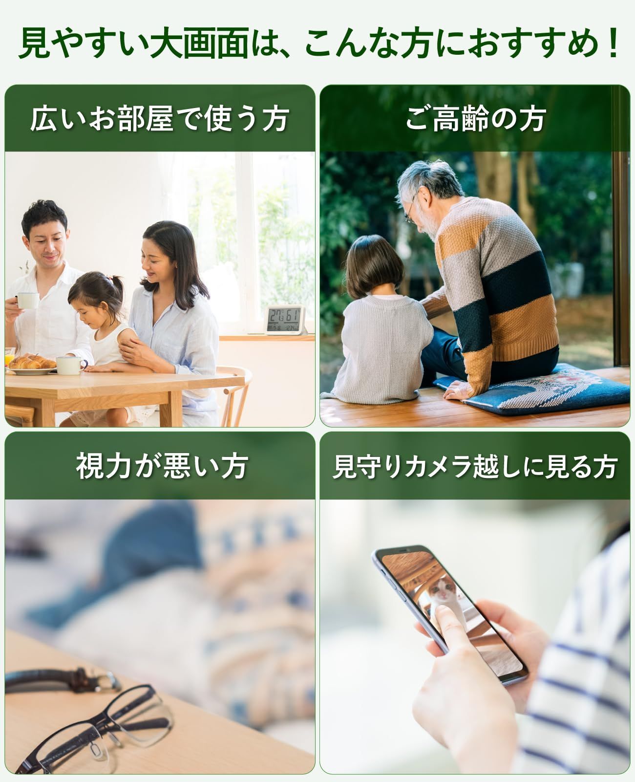 ・大きくて見やすい大型表示・バーで直感的に分かる環境判定・最大・最小温湿度表示・西暦も表示するカレンダー・時計表示・アラーム機能・スヌーズ機能