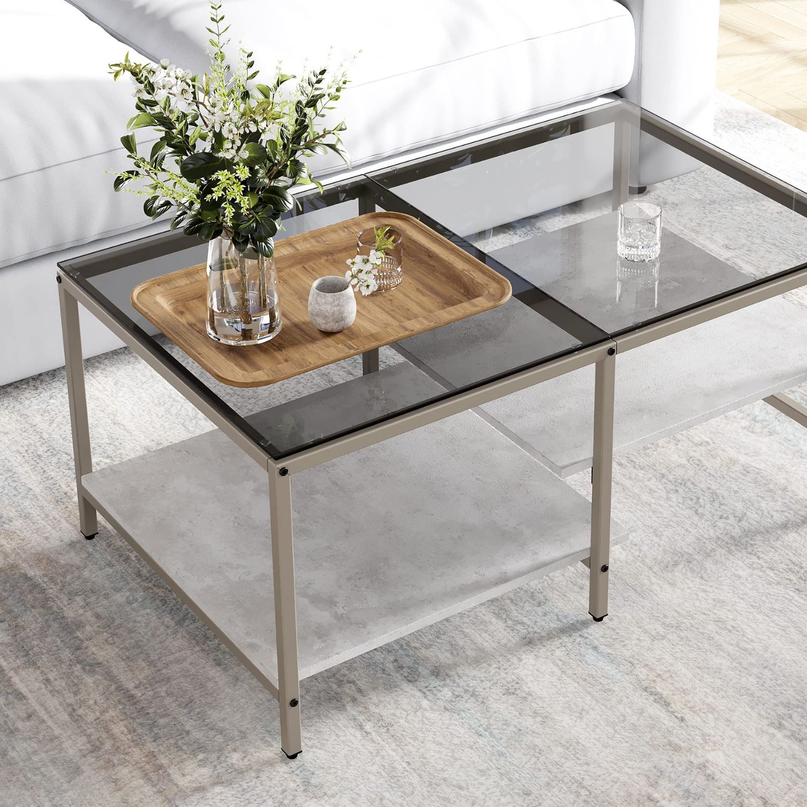 ガラステーブル 二段収納 強化ガラス センターテーブル 収納付き おしゃれ ローテーブル リビング 一人暮らし HOMOOI 幅100×奥行60×高さ45 cm 岩グレー