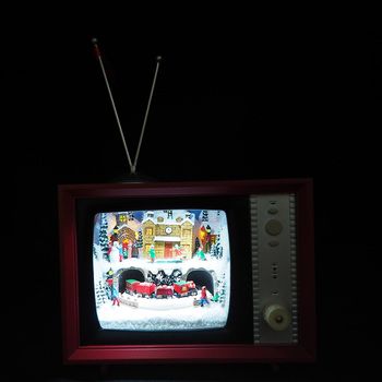 スイッチを入れると、TVの中の明かりが灯り、汽車が走り、さまざまなクリスマスソングが流れ始めます。