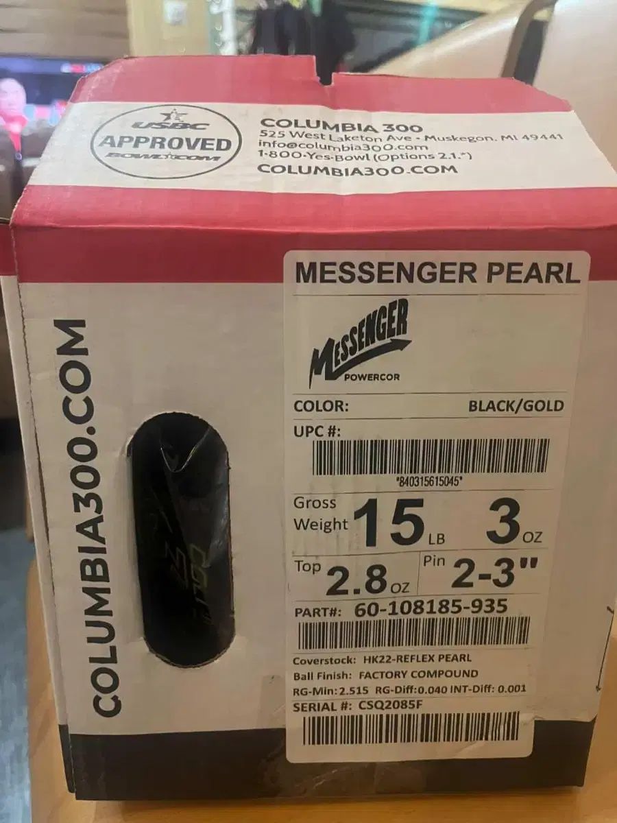 これはブラックとゴールドのパールをあしらったメッセンジャーボウリングボールです。パワーコアテクノロジーを搭載した15ポンドの製品です。これはコロンビア300のボーリングボールです。ご不明な点がなければ、すぐに安心してお支払いいただけます!まだ使ったことがないフルボックスの新品です!!費用は24万7千ウォンです