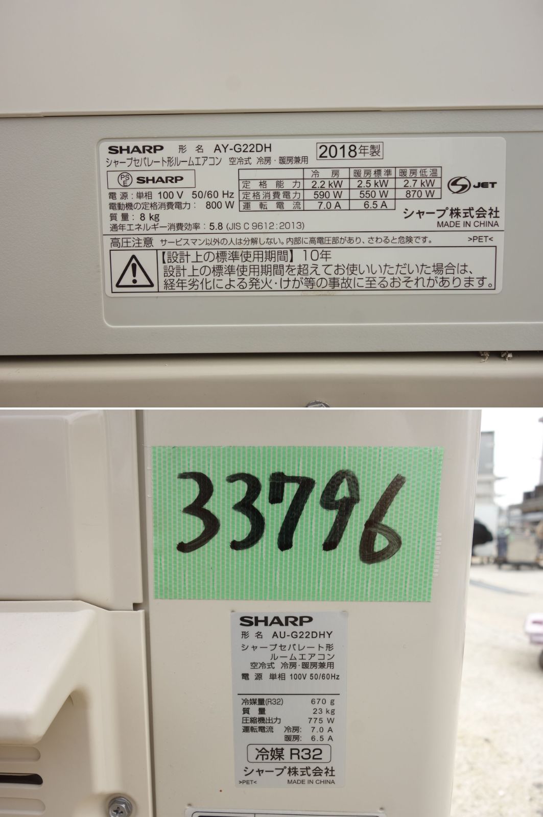 M シャープ ルームエアコン 2018年 2.2 kw ~8畳 プラズマクラスター搭載 標準モデル コンパクトタイプ AY-G 22 DH 33796