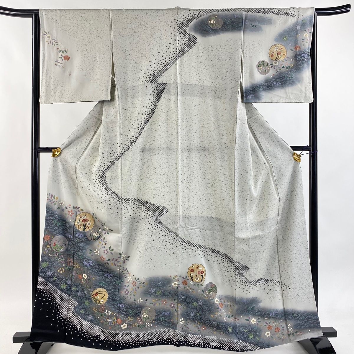 訪問着 身丈162 cm 裄丈65.5 M 袷 袋帯セット 草花 金彩 ぼかし 灰色 正絹 秀品