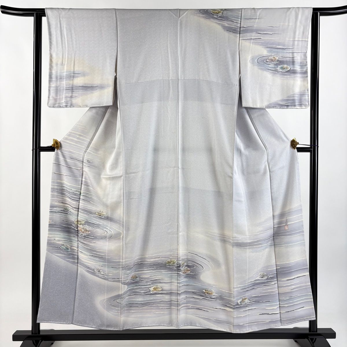 訪問着 身丈153.5 cm 裄丈61.5 S 袷 落款 流水 葉柄 金彩 ぼかし 灰色 正絹 秀品