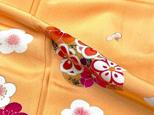 ちょっと 品 七五三 着物 3歳 正絹 フルセット 女の子 友禅 絵羽柄の着物 被布セット 赤x黄色 梅 t 893 set