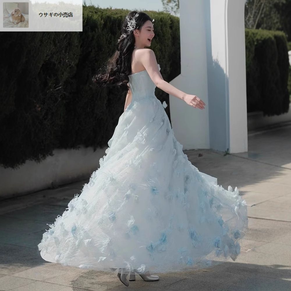 ブルーフラワーイブニングドレス 2025年新作 高級感 軽奢華 ハイエンド 成人式 芸術試験 軽量ウェディングドレス 新婦