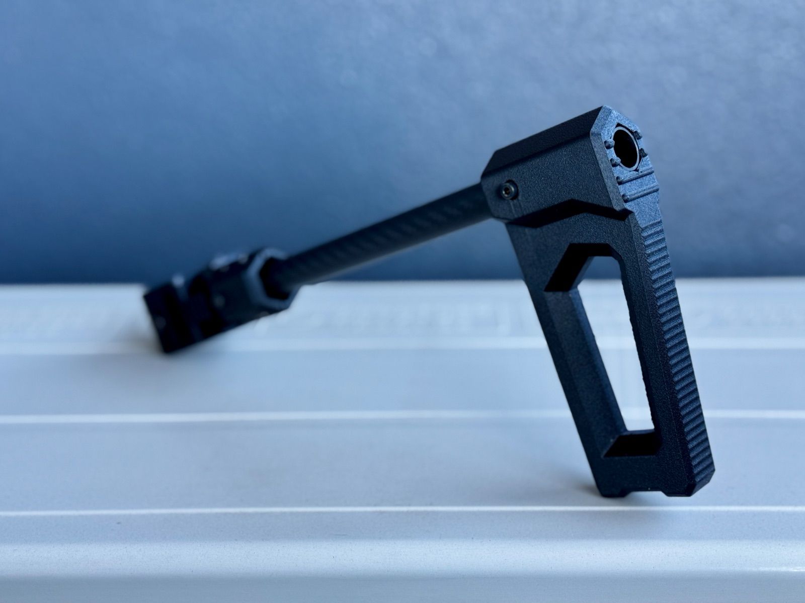 カーボンパイプ(直径15ミリ)を使ったフォールディングタイプの軽量ストックです。