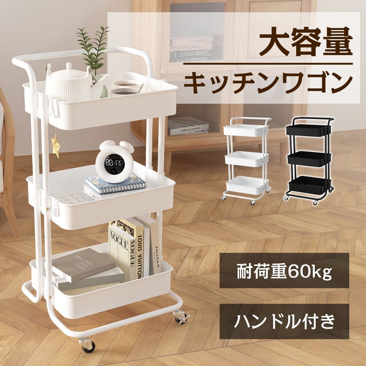 三段設計で収納しやすく、キッチン調理品、食品、日用品、散らかりがちな小物の収納や本や雑貨などすべてまとめて収納管理できます。