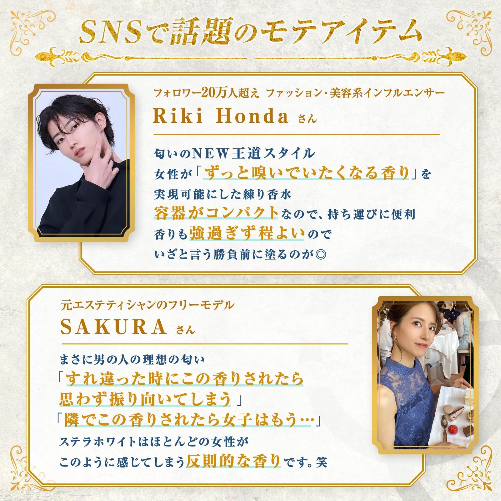 多くの男女から絶賛の嵐! これを嫌がる女性はいない 他のメンズ香水と比べても爽やかな香りでこれをつけているだけで清潔感がある男性なんだよ感じられます。これを付けてる男性がいると… 香りを嗅いだ瞬間、落ちてしまいそうな奥深くに色気を感じます。 ステラホワイトを付けてるだけで女性の印象は間違いなく変わる気がします。 今までの香水とは違う 私はヘアバームとしても使っているのですが、すれ違った時に意識してもらえるのか百発百中レベルで『いい匂いだね』と女の子から言われるようになりました。 保湿効果もアリ 普通の香水とは違い、練り香水でバーム状になっているので肌の保湿もできて香りもいいので一石二鳥です。