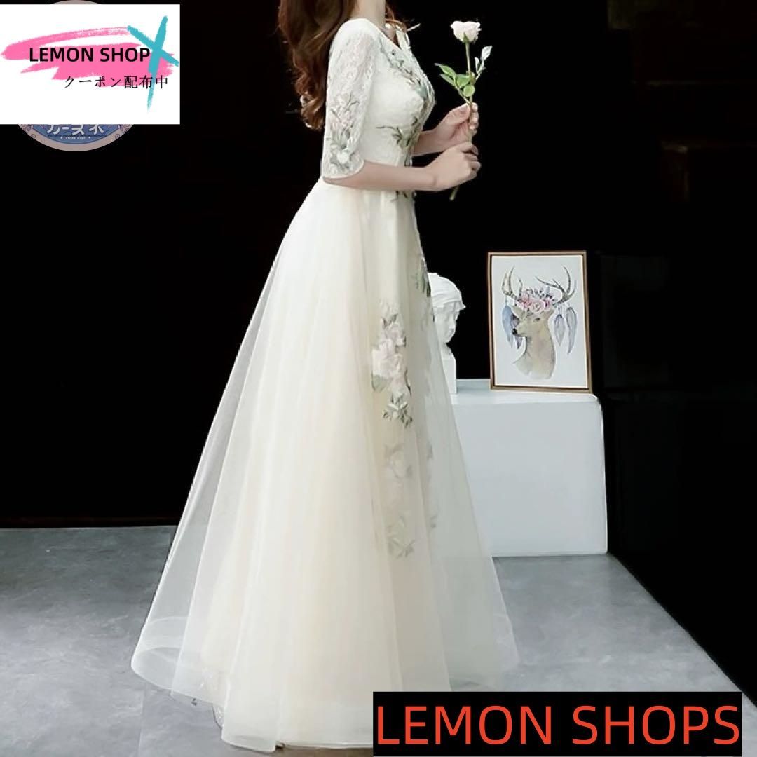 花柄レースに刺繍が美しい 5分袖のチュールイブニングドレスLEMON