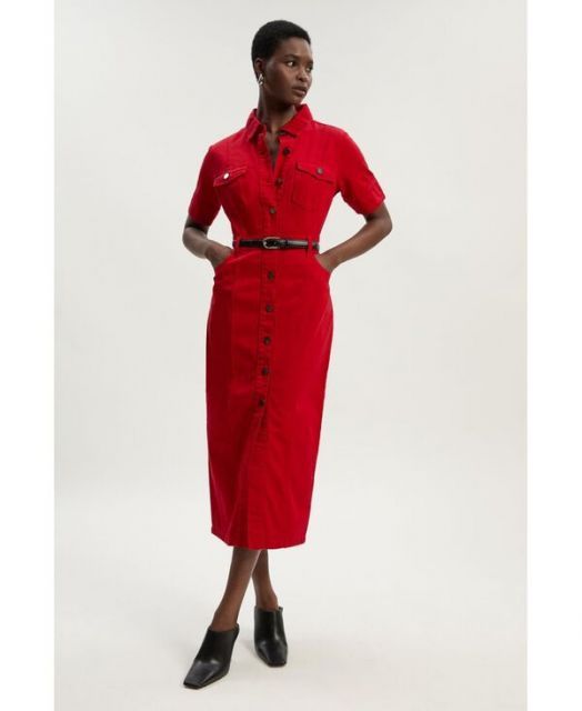 カレンミレン レディース ワンピース トップス Women s Petite Denim Short Sleeve Shirt Dress Red