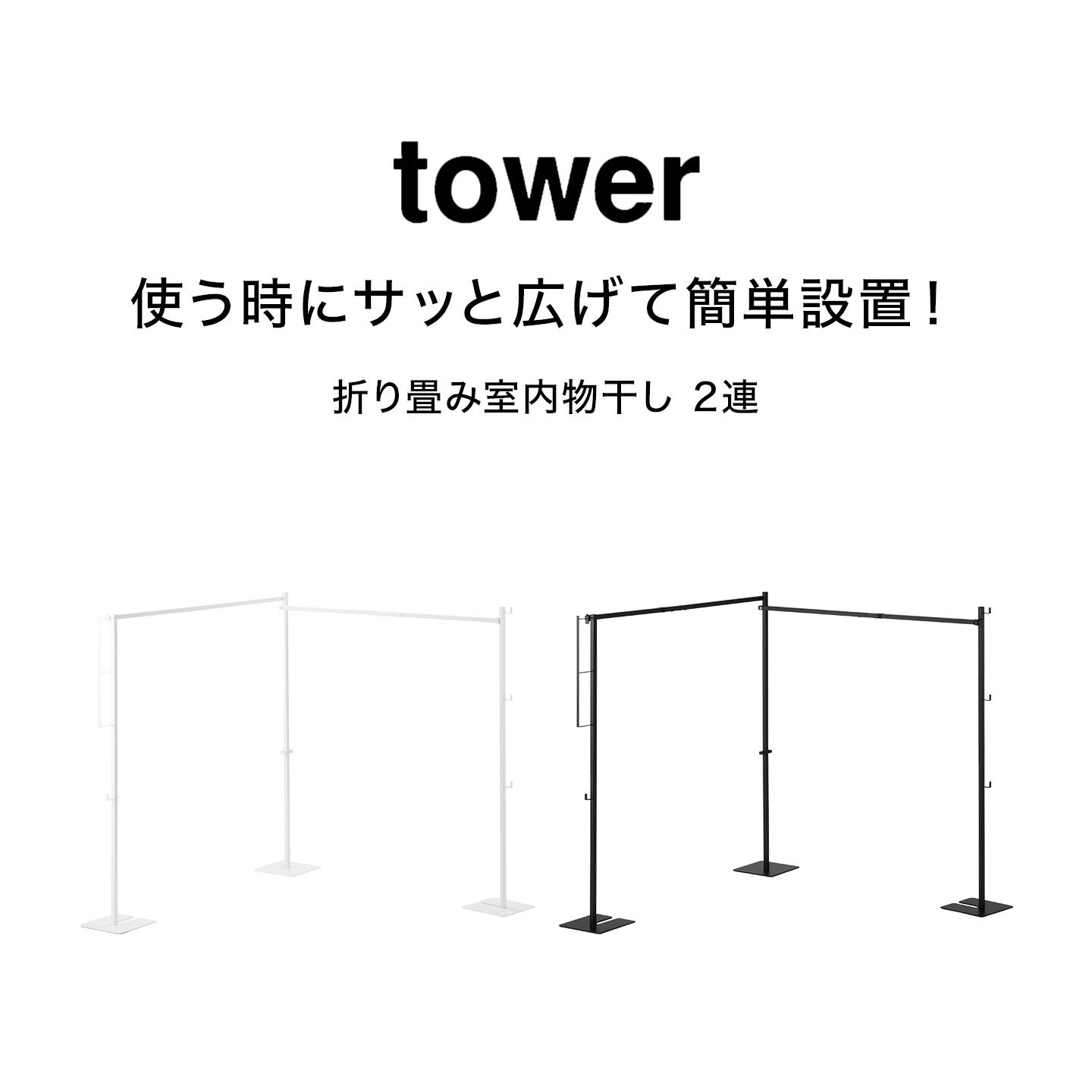 山崎実業 折り畳み室内物干し タワー 公式 tower 10266 10267 ホワイト ブラック 白 黒 物干しスタンド 大容量 部屋干し 室内干し 物干しラック 物干しハンガー 大家族 室内用 梅雨 コンパクト 折り畳める 省スペース おしゃれ シンプル 頑丈 布団干し 花粉 黄砂 洗濯 雨天 一時干し 収納 干し竿 新生活 ファミリー向け ハンガーラック スタンド スリム スタイリッシュ L字型 I字型 高級感 ラック フック付き 折りたたみ 賃貸 便利 ランドリー 洗濯物 洗濯グッズ マンション アパート 一人暮らし ひとり暮らし 1人暮らし 二人暮らし ふたり暮らし 2人暮らし 家族 一戸建て 戸建山実 やまじつ ヤマジツ やまざき じつぎょう たわー towerシリーズ ブランド インテリアブランド モダン 無地 北欧 オシャレ お洒落 モノトーン スマート Tower Folding Indoor Laundry Drying Frame With 2 Racks