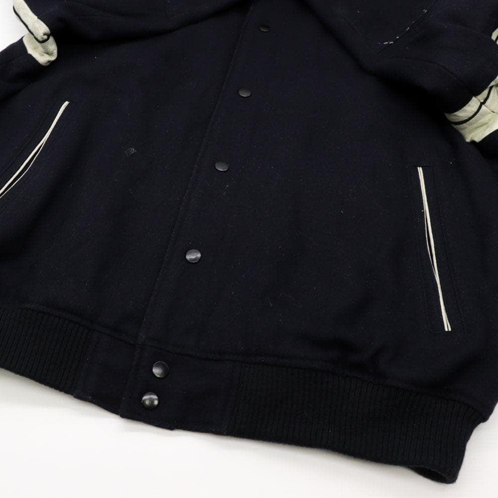 タージマハル 胸にはブランドロゴ刺繍のはいる本革ショルダー切り返しモデルのスタジャン。ベーシックなネイビー、メルトンウール、太アーム、ゆるダボ、クラシックシルエットのスタジャンです《WN》