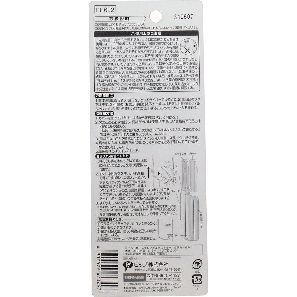 内容量:1個(本体、耳そうじ棒、カバー、お試し用単4形乾電池1個)