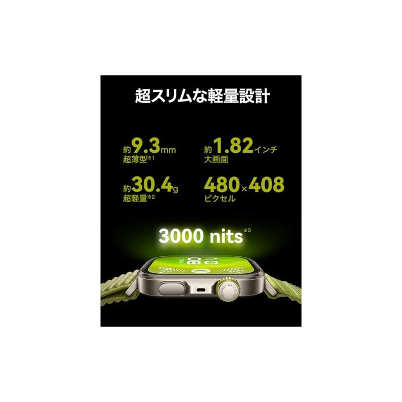 【薄型軽量で頑丈なボディ、アップグレードしたディスプレイ】厚さ約9.3mm、重さわずか約30.4g。スリムなボディに、超強力なチタン合金ベゼルと航空機グレードのアルミニウム合金を採用、1.82インチのディスプレイはサファイアガラスで頑丈にカバーされ、3000nitsの明るさはアウトドアでも鮮明に見えます。