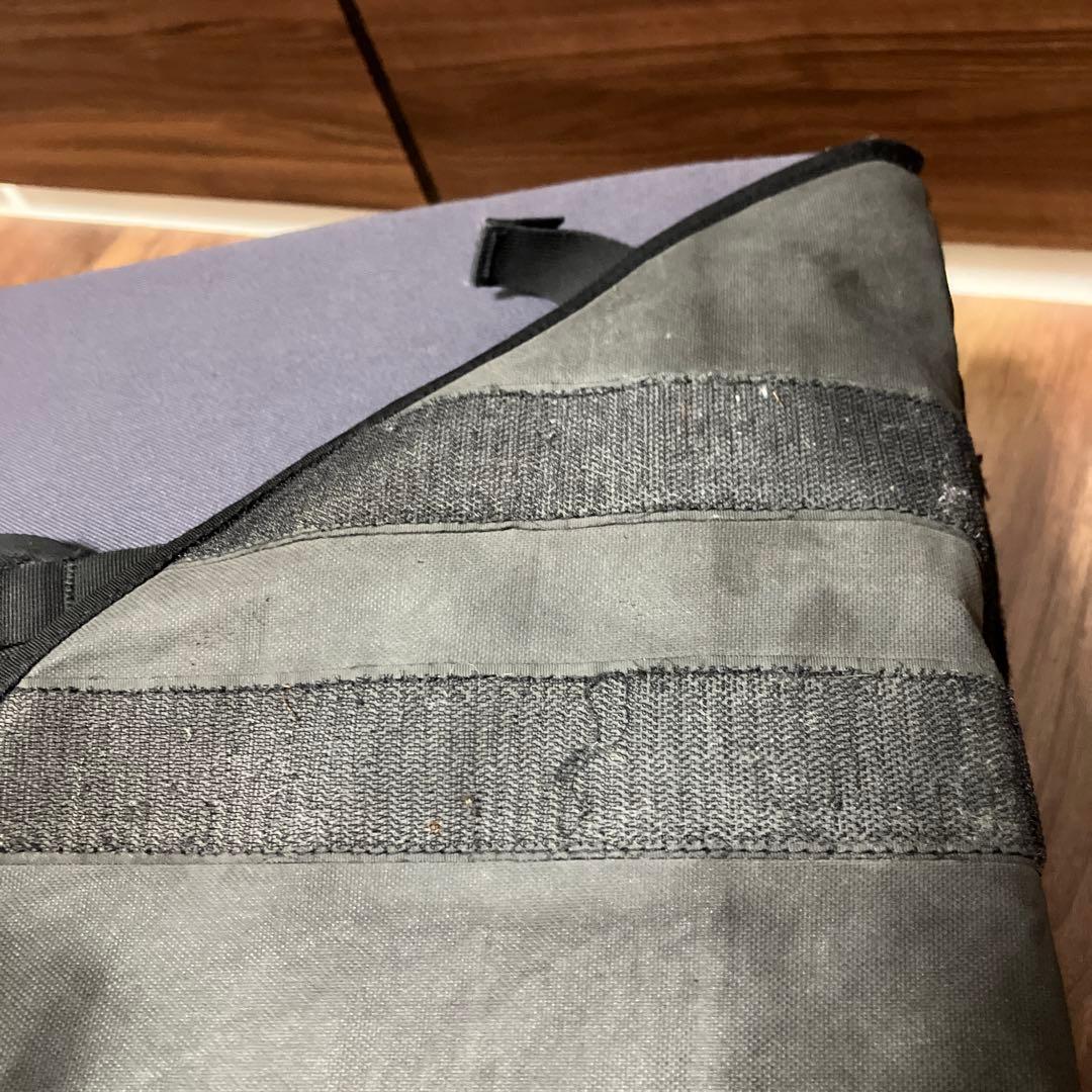 フラップが一枚の古いモデルです。破れやヘタリ等はありませんが、バックル部分の小傷、角の毛羽立ち、マジックテープに繊維が絡んでいる、など使用感があります。表面は水拭きして清掃してあります。