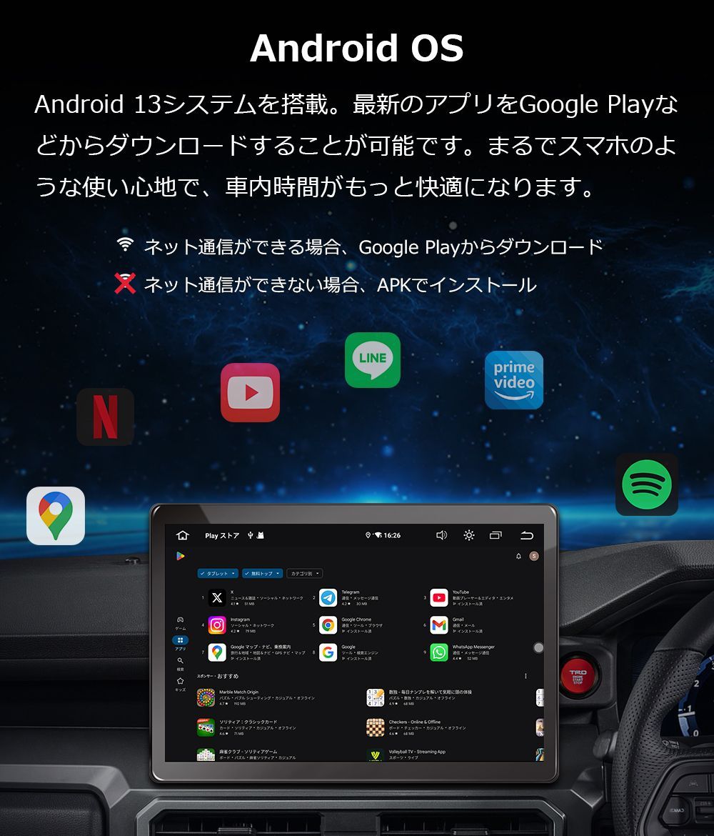 Android 13システムを搭載。最新のアプリをGoogle Playなどからダウンロードすることが可能です。まるでスマホのような使い心地で、車内時間がもっと快適になります。