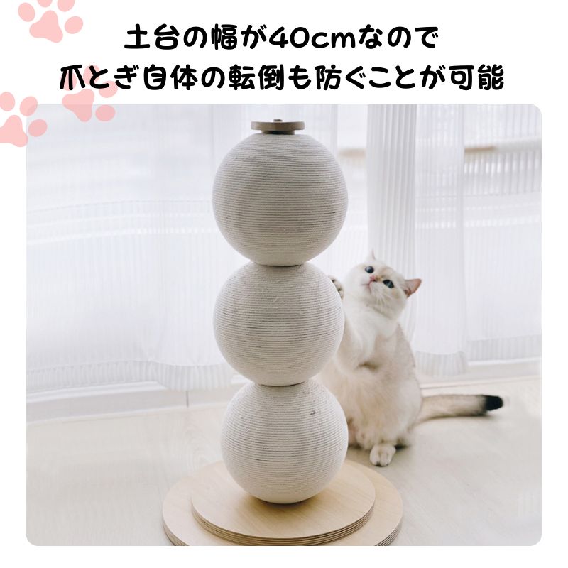 40cm幅の広い土台がしっかりと支えるため、元気いっぱいのネコちゃんでも転倒の心配がありません。安心して使える設計です。