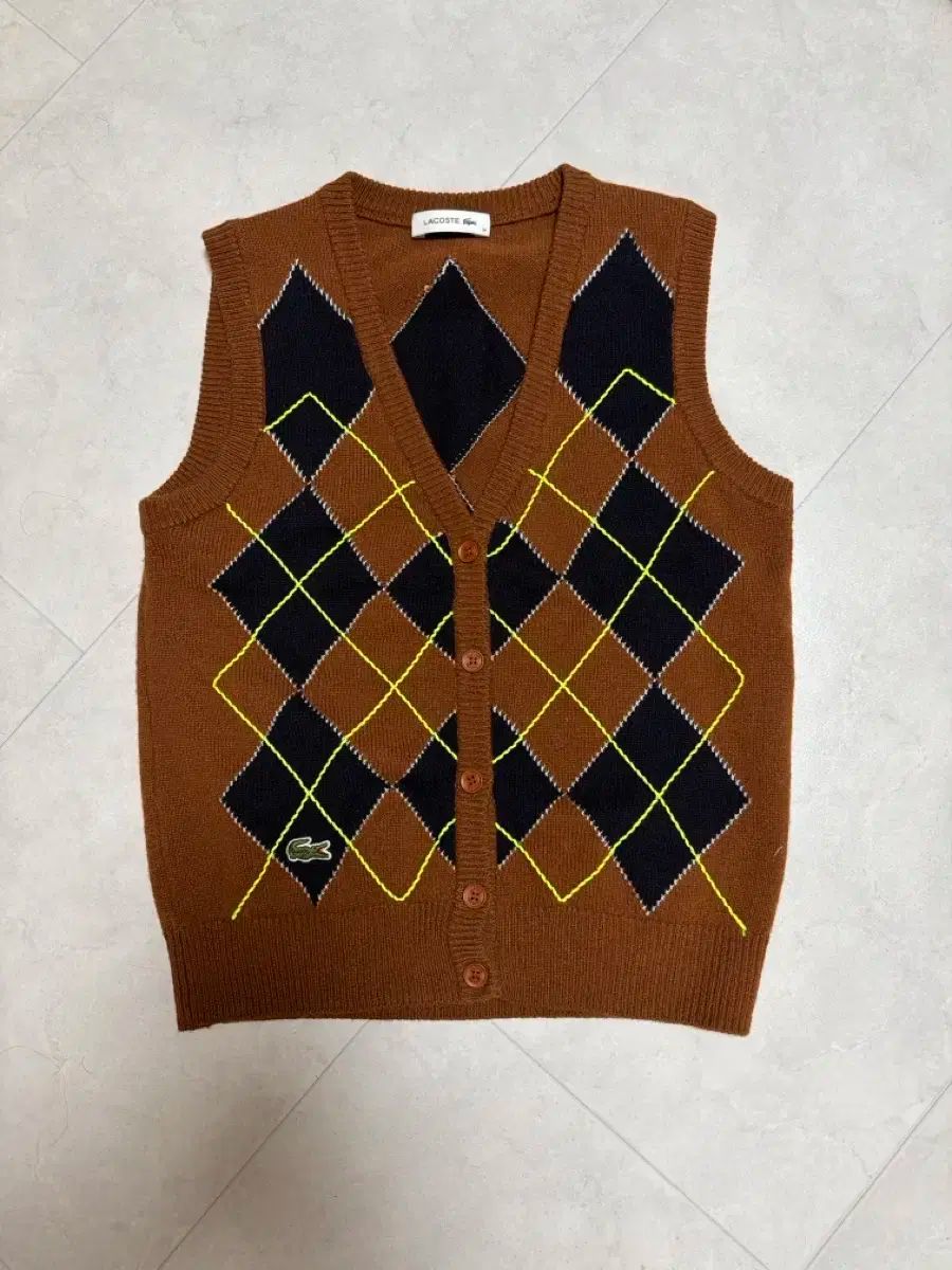 ブラウン カラーのラコステ アーガイル ニット ベストです。34 サイズで、55 サイズ 着用の方に オススメ です。可愛い デザイン で ポイント 付け に 良い です。별도 コメント 無ければ すぐに 安全決済 お願いします!