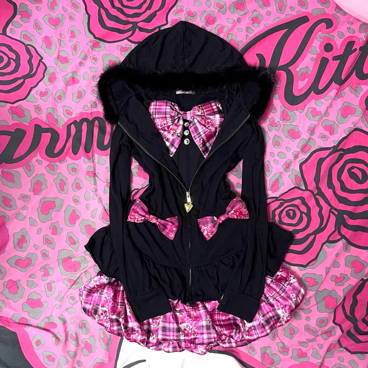ファー トリミング フーディーとローズ CHECKERED PATTERN のミニリボンがPOINTのSugar Gloss ブラック ジップアップです - ♡̷̷̷ ハート型のゴールド ジッパー チャームにはMA*RS 刻印がされています ૮꒰ᐡᴗ͈ 。 ᴗ͈ᐡ꒱ა