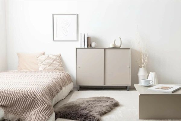 シンプルながらも洗練されたデザインで、空間にすっきり落ち着いた印象を与える『Putie(プティ)』キャビネット。開閉に場所をとらない引き戸仕様と奥行きを抑えたスリムな設計で、限られたスペースでも無理なく設置可能。扉の前に余分なスペースを取らず、生活動線を妨げることなく置けるため、ワンルームや一人暮らしのお部屋にも最適です。また扉付きで中身を隠せるため、生活感を抑えたすっきりとした空間づくりを実現します。