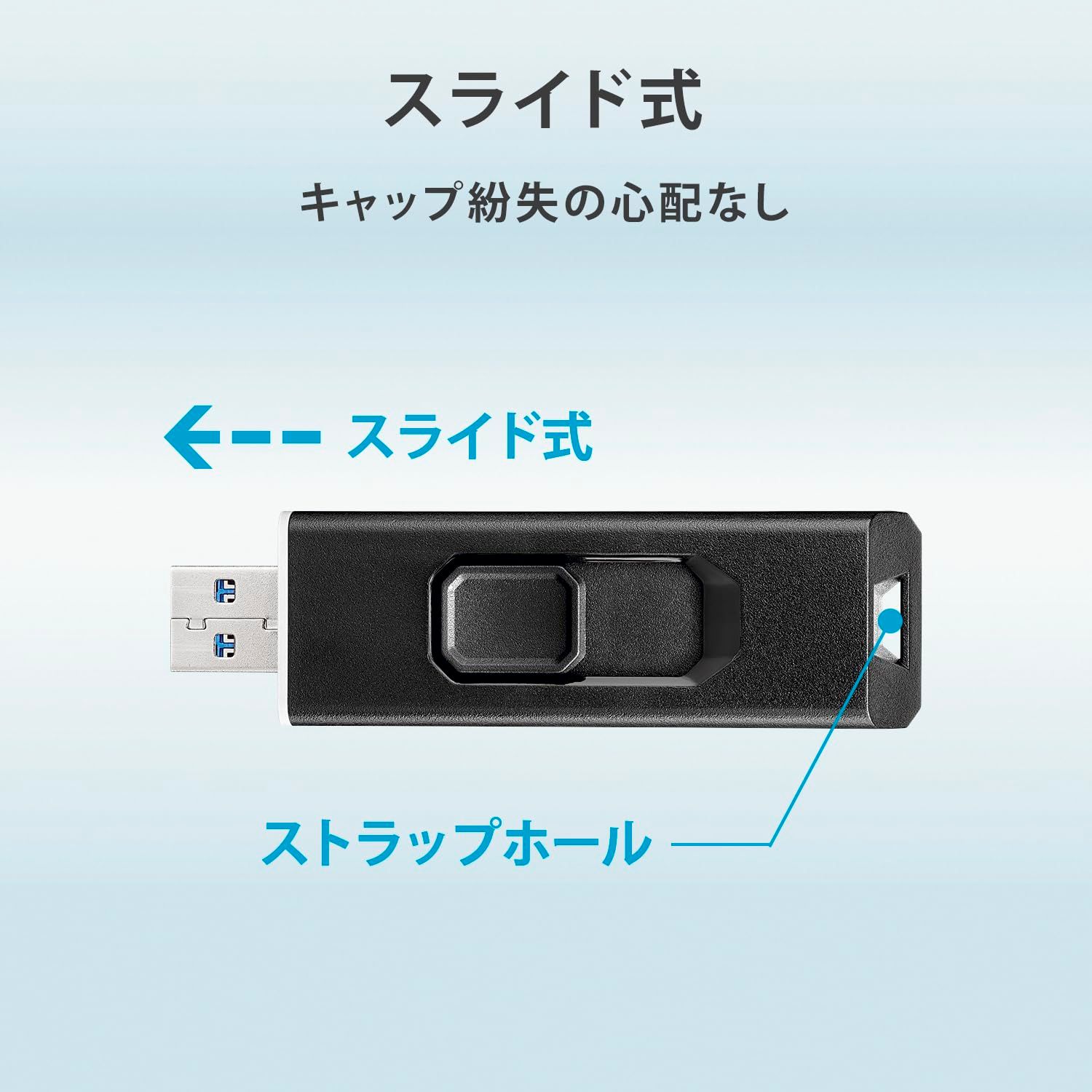 【スライド式だから、キャップ紛失の心配なし!】約23.5×68.8mmと、USBメモリー同等の小型サイズ。スライド式のため、キャップ紛失の心配もありません。また、ストラップホールも付いているので無くさないようにカバン等につけることも可能です。