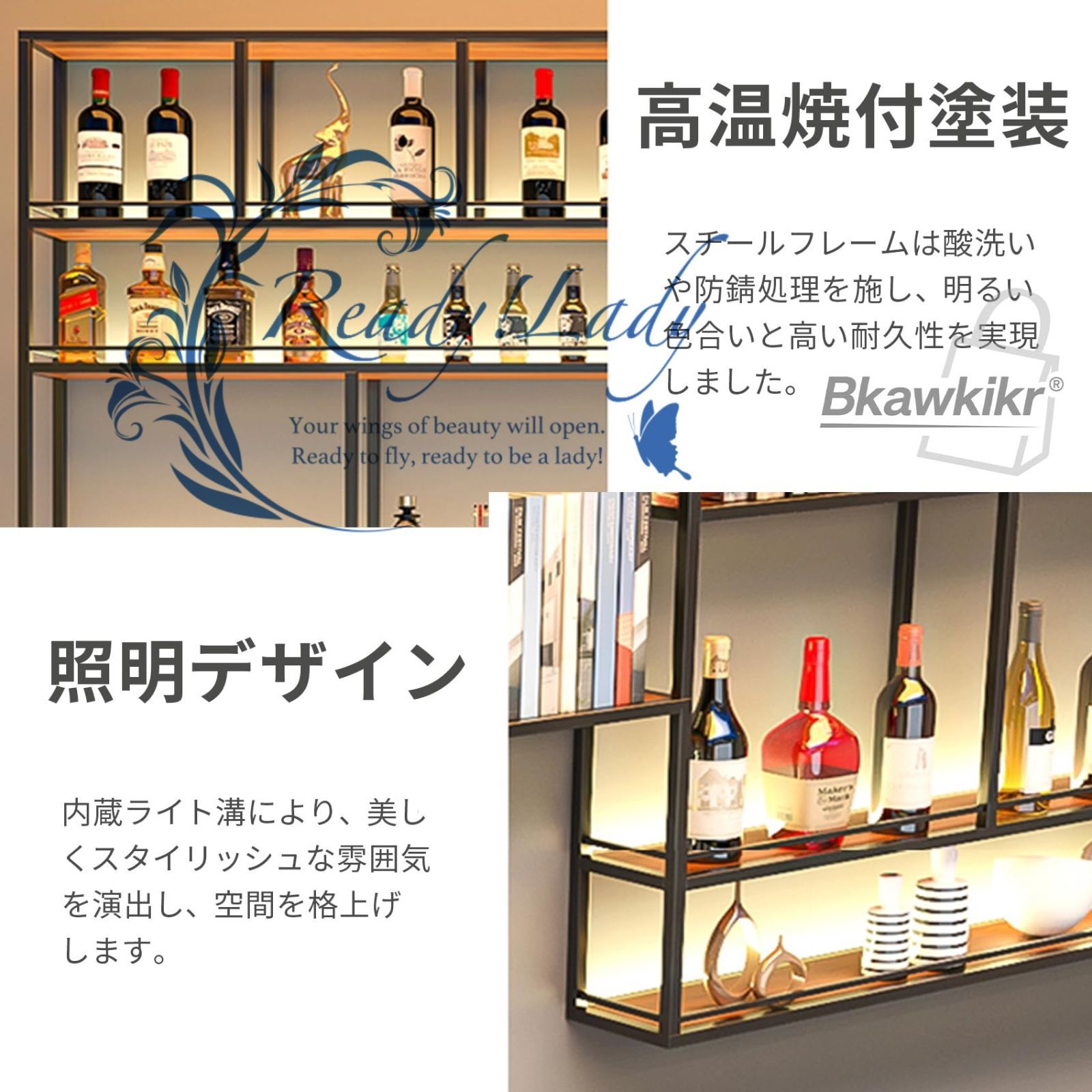 高温焼付塗装で頑丈耐久: スチールフレームは酸洗・防錆処理済みで、明るい色合いと高耐久性を実現。長期間ワインや装飾品を収納可能。
