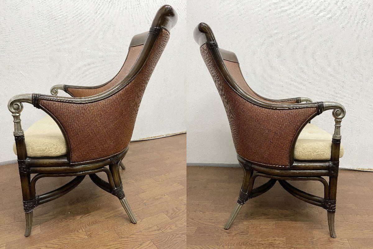 重厚な木製フレーム、背面にはラタン調の編み込みをあしらい、肘先には装飾的なディテールが施されています。