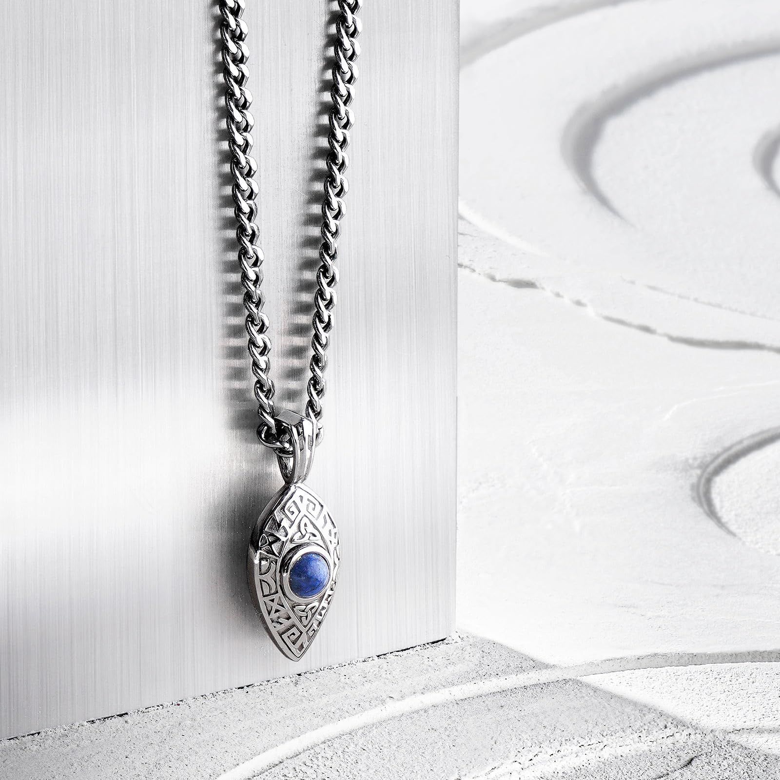 プレミアム天然石: ペンダントには、成功、富、信仰、名誉といった本質的な価値を象徴するルーンが複雑に刻まれています。高品質のスターリング・シルバー製で、見た目が美しいだけでなく、長持ちします。中央には、鎮静作用と内なる叡智を促進することで知られるデュモルティエライトの球があしらわれています。さらに、トリニティ・ノットは、心、体、精神の相互のつながりを表し、人生におけるバランスと調和の重要性を強調しています。