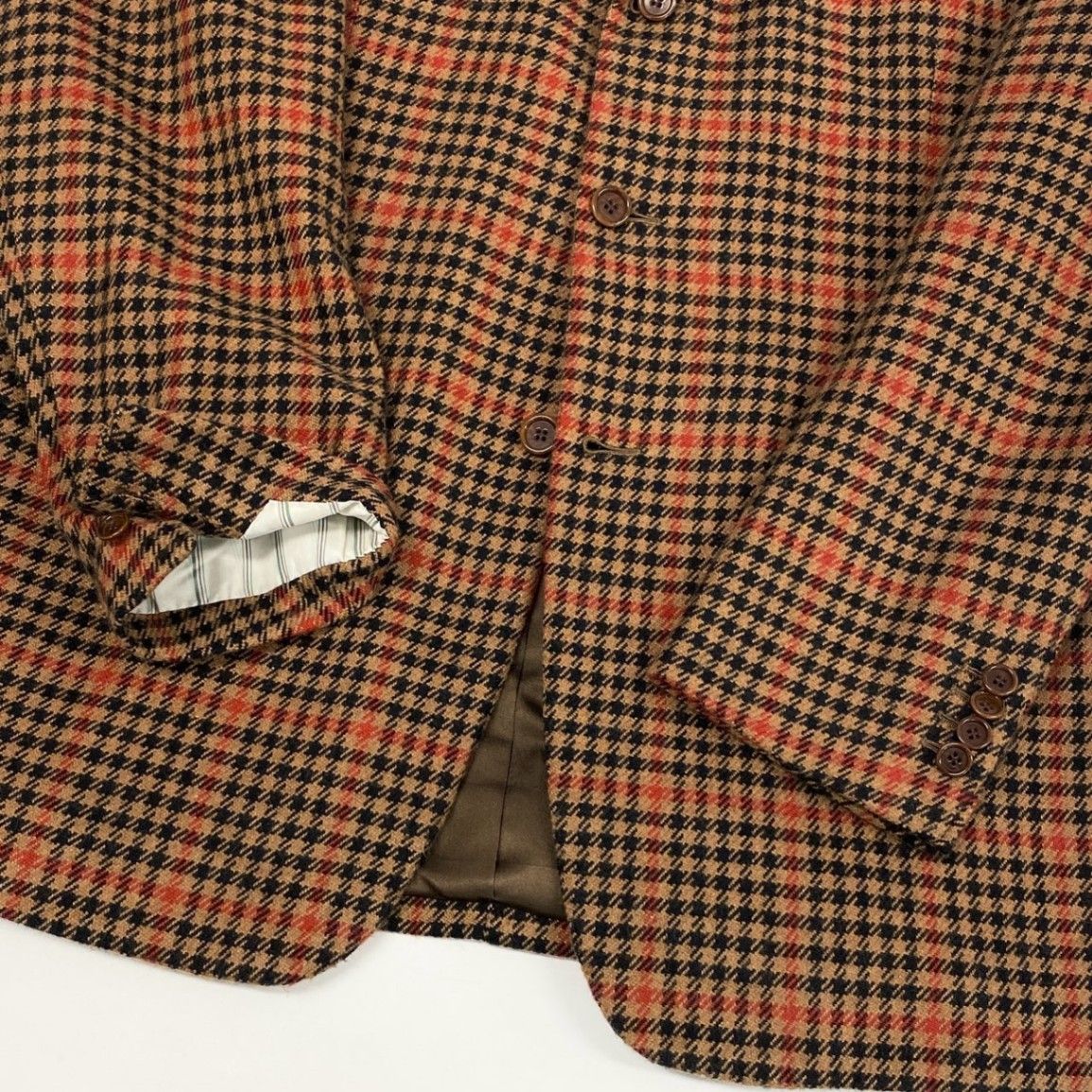 落ち着いたブラウン×オレンジ系の英国チェック柄が印象的な、Tindaro de Ruca「サルトリア ミラネーゼ」テーラードジャケットです。ウールらしいマットで上質な質感に、2005年ビスポークらしい重厚な構築美が映える一着。ロング丈のしっかりしたシルエットで、クラシックな英国調コーデや大人のカントリージャケットとして活躍します。XXLのゆったりサイズで、肩周りや胸囲に余裕が欲しい方にも安心。ビジネス、ジャケパン、トラッドスタイルなど幅広いシーンで着用いただけます。