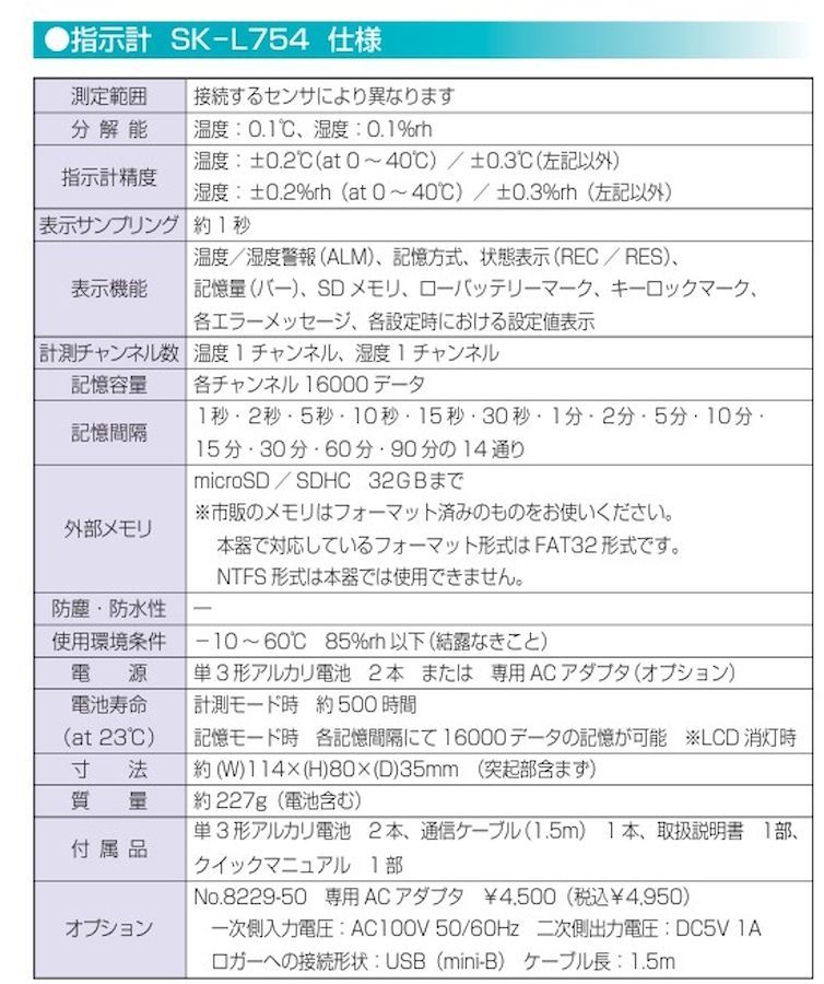 ・記憶計「SK-L750シリーズ」は、温度または温湿度の測定値を記憶できるデータロガーです。