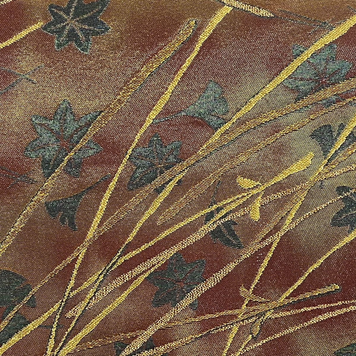 袋帯 秀品 吹き寄せ 霞 箔 焦茶色 六通 正絹