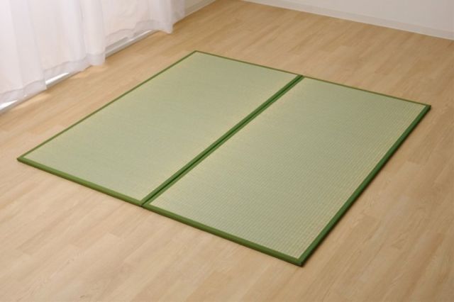 届いたユニット畳を床に置くだけで和のスペースが出来上がります。表生地には国産(九州産)のい草を使用しています。一本一本が太く、表皮が厚く繊維がキメ細かいので弾力性があり、耐久性に優れています。い草には空気の自然浄化作用、湿度の調節作用などがあります。また汚れにくく、使用するうちに黄金色に変化し、味が出ます。中材には10mmの硬わたを使用しておりますので適度なクッション性があります。裏地には滑りにくいウレタンフォームを使用しています。青森県尾ヒバの木から抽出した「ヒバエッセンス」をメーカー独自の技術で生地表面に加工しました。ヒバエッセンスにはヒノキチオールという、天然物物質としては極めて抗菌性の高い成分が含まれています(無加工品に比べ抗菌、防臭効果)。また軽量タイプなので、持ち運び、設置、片づけなども楽にできます。