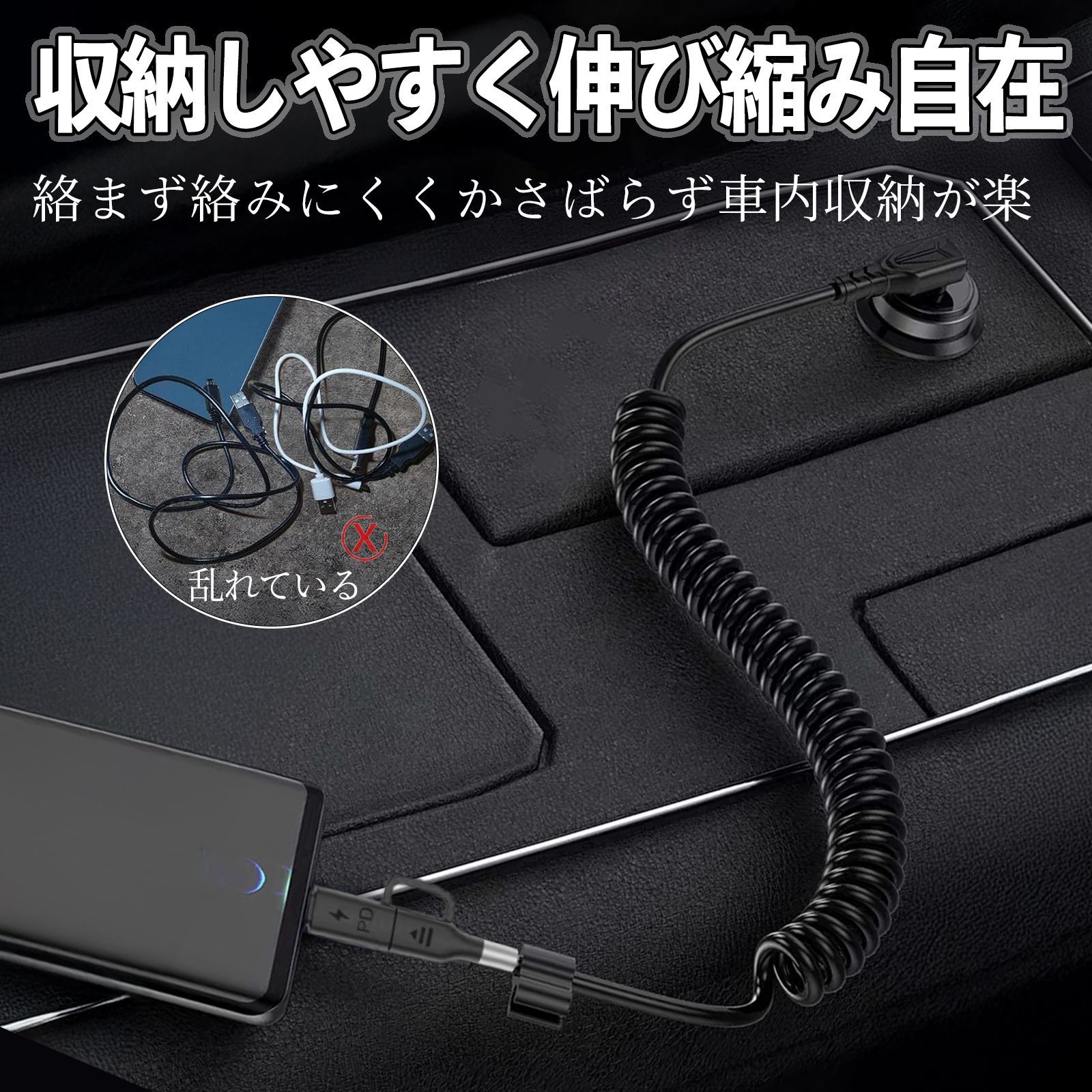 コイル状デザインで絡まず、コンパクトに収納でき、車内のスペースも有効活用できます。