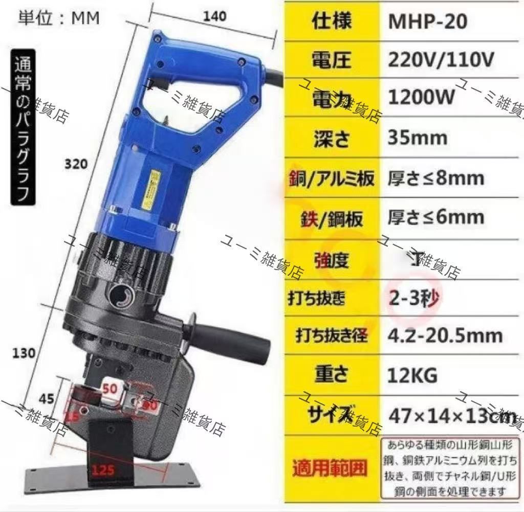 最も 電動油圧パンチャー 10 t 強力 パンチダイ5種付 φ6 5~20 5 mm 1200 W AC 100 V 鉄板 鋼板 110 山形鋼対応 油圧式 パンチ 穴あけ工具