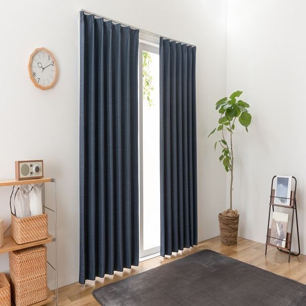 ネイビーとベージュの2配色展開。ネイビーは2級遮光、ベージュは3級遮光の遮光機能が付いたドレープカーテンです。生地はしっかりとした厚みがあります。お部屋が暗くなりすぎず光を程よく取り込めます。ウェーブを綺麗に保つ“形状記憶加工”を施しており、洗濯しても型崩れしません。同色のタッセルとアジャスターフック(Aフック)が付属されております。